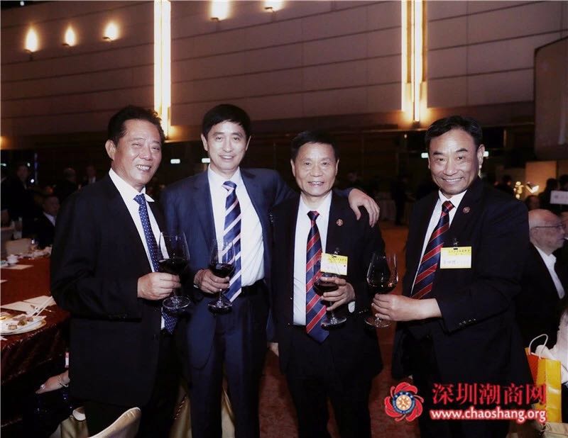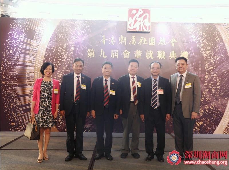 香港潮属社团总会副主席林镇洪(右二)、张章笋名誉会长(右三)、黄育宏驻会会长(左三)、黄梓琪秘书长(左二)、北京潮商会常务副会长兼秘书长周建轩(右一)等合影