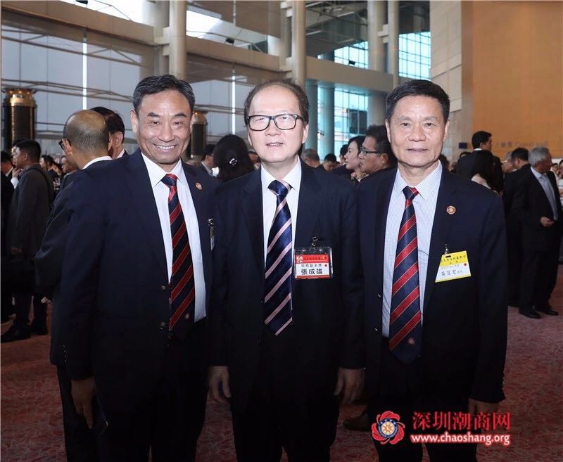 香港潮属社团总会常务副主席张成雄(中)与黄育宏驻会会长(右)、黄梓琪秘书长(左)合影