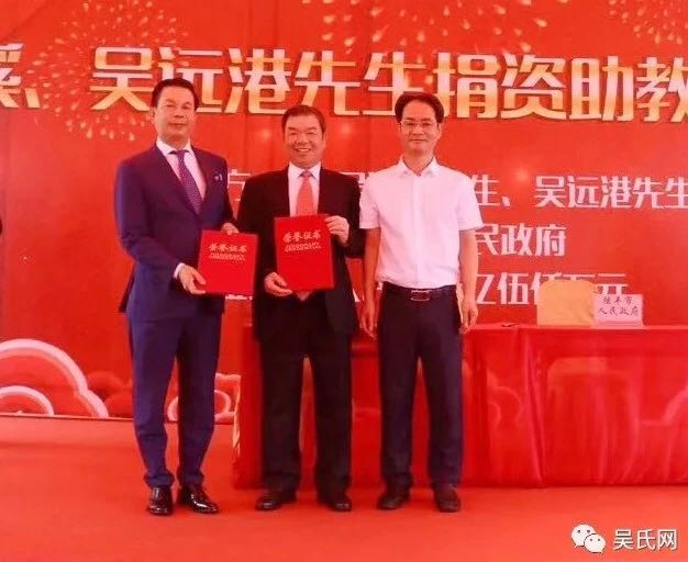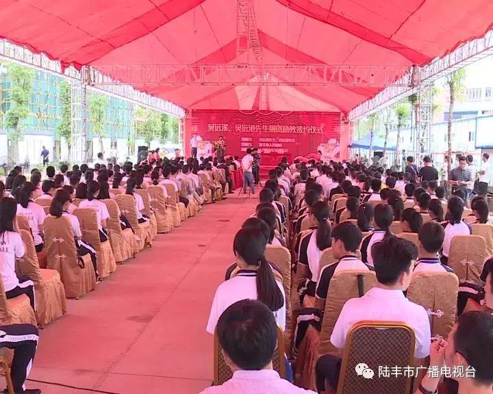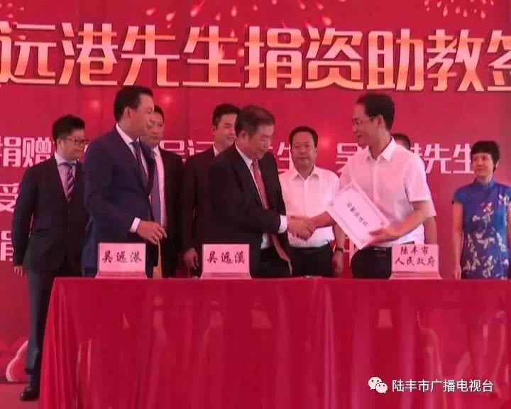 2018年6月6日上午,陆丰市在龙山中学新校区举行下载安装 名誉会长吴远溪、吴远港先生捐资助教签约仪式,接受吴远溪、吴远港先生用于龙山中学新校区和大安中学新校区建设的3.5亿元捐款,推动陆丰市教育事业实现新发展。陆丰市委书记邬郁敏,市长许伟明等人出席了捐献仪式。