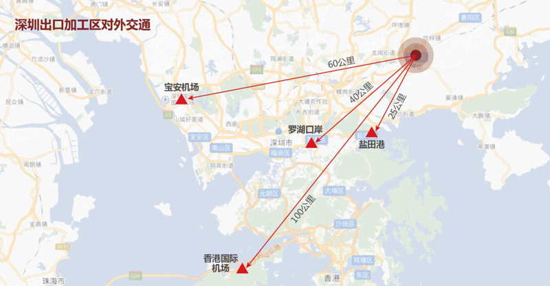 加工区紧邻深圳高速,距离罗湖、文锦渡、皇岗等陆路口岸约40公里,距离盐田国际集装箱港口、广深铁路编组站约25公里,距深圳宝安机场60公里,距香港国际机场约100公里。