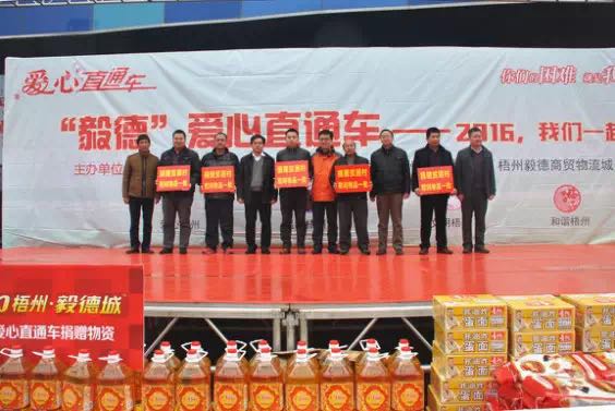 ⊙2016年1月21日,“爱心直通车春节送温暖”梧州▪毅德城携手梧州市万秀区区委、长洲区区委、市直属机关工委和梧州日报社党委,开展“爱心直通车”——2016,我们一起送温暖活动,为梧州地区的160户困难家庭送去大米、面饼、食用油、腊肠等慰问品;