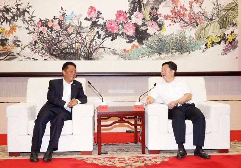 汕头市委书记方利旭(右)与深圳市汕头商会会长郑汉明(左)交流