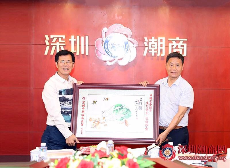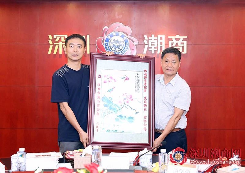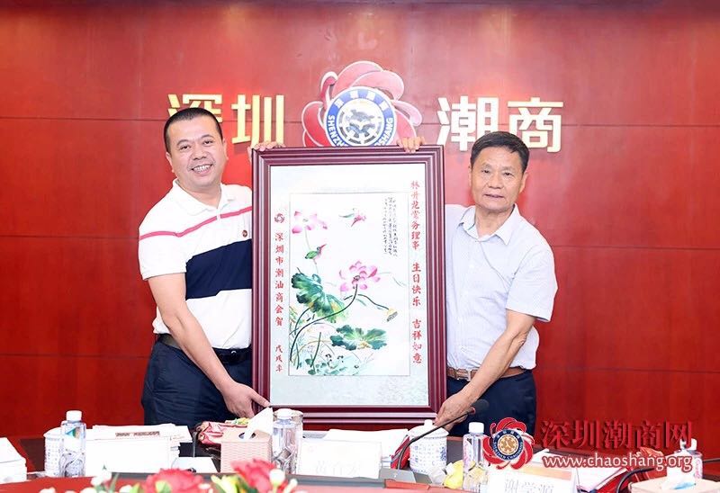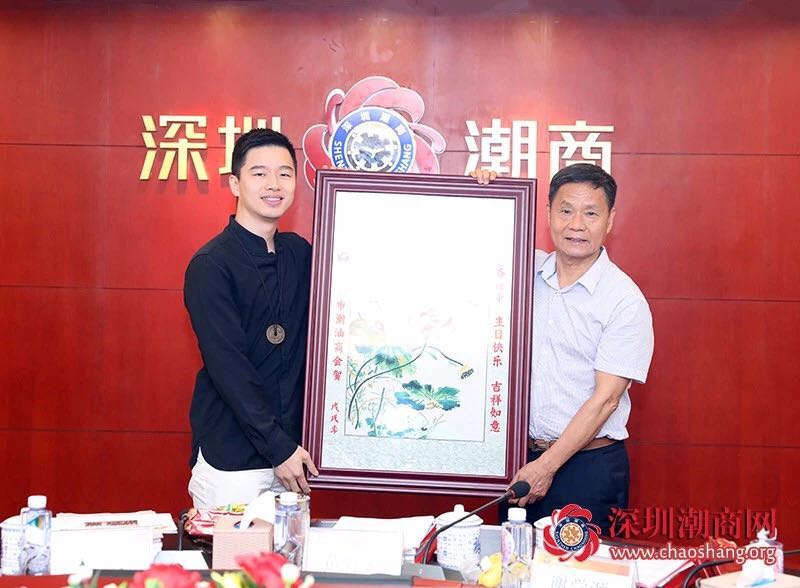 黄育宏驻会会长代表商会为七月份的寿星卓鹏、陈庭纬、郑嘉川、姚楚鸿、林开龙分别送上一幅潮绣珍品作为生日贺礼