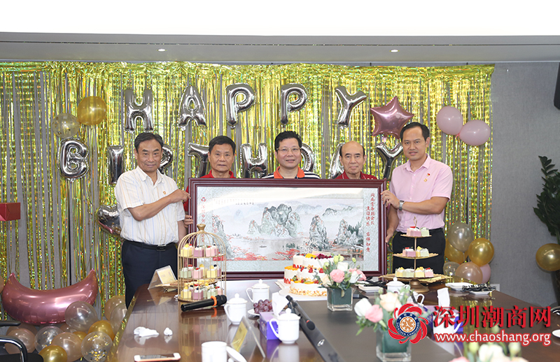 黄育宏驻会会长、邓东书记、黄梓琪秘书长代表商会向周南常务副会长送上一幅潮绣珍品作为生日贺礼