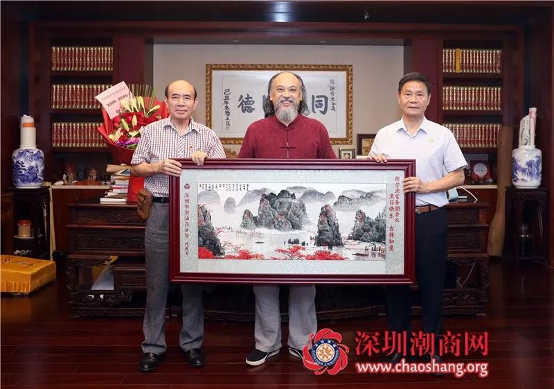 黄育宏驻会会长、邓东书记代表商会向谢学源常务副会长送上一幅潮绣珍品作为生日贺礼