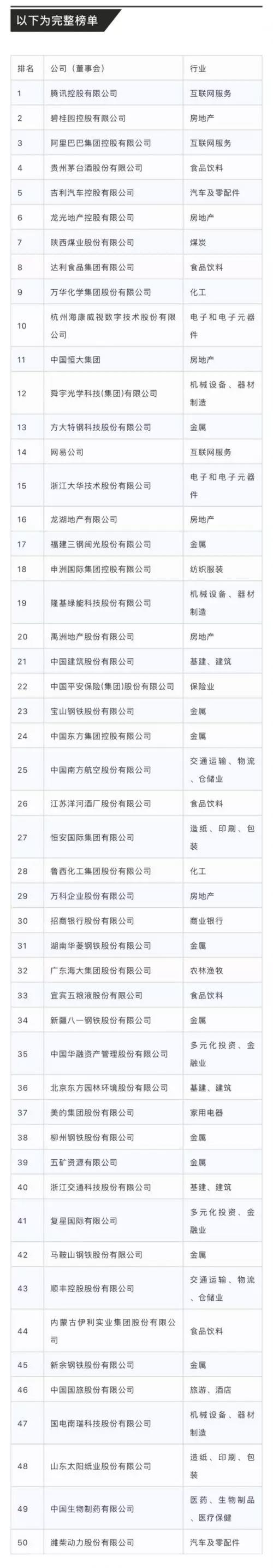 2018年7月17日,由《财富》和怡安翰威特咨询首次联合开展的“中国最佳董事会50强”评选结果揭晓,我会荣誉会长马化腾单位腾讯控股有限公司名列榜首,荣誉会长纪海鹏单位龙光地产控股有限公司在该榜单中排名第六位。其中,在房地产行业中有碧桂园、恒大集团、万科等房企上榜,龙光地产位居第二。