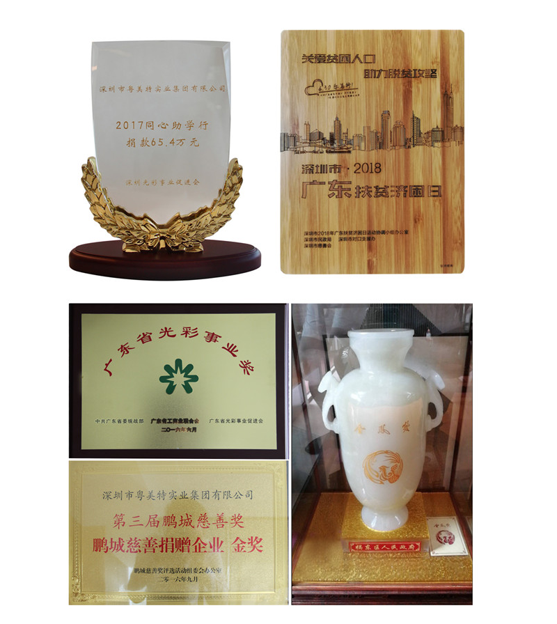关爱贫困群体,共创美好生活。多年来,粤美特集团在企业发展的同时,坚持积极参与各项公益慈善事业,许锦光董事长身体力行,二十余载坚持为家乡弱势群体捐款捐物、出资修桥铺路。集团先后获得“广东省光彩事业奖”、“鹏城慈善捐赠企业金奖”、“金凤奖特别贡献奖”等奖项。