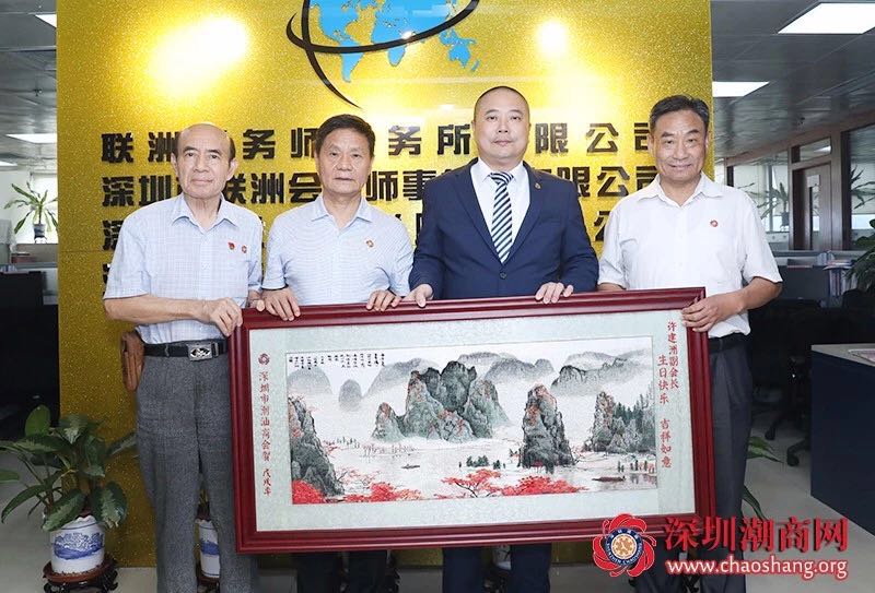 黄育宏驻会会长(左二)、邓东书记(左一)、黄梓琪秘书长(右一)代表商会向许建洲副会长送上一幅潮绣珍品作为生日贺礼