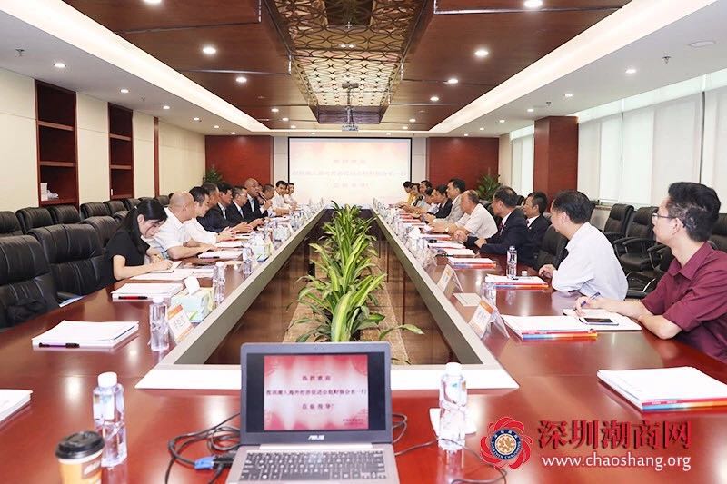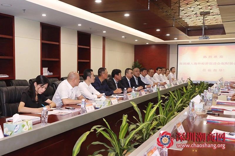 2018年7月26日上午,深圳潮人海外经济促进会会长赵财强一行莅临我会交流座谈。随同来访的有监事长黄坤炎,常务副会长陈健辉、郑石非,驻会会长姚金城,常务副会长杨展雄、赵楚龙、张伟杰、彭少龙、赵德坚、张小莹,副秘书长舒欣、蔡伟淮等。