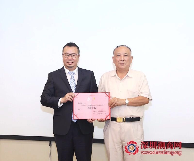 赵财强会长(左)代表深圳潮人海外经济促进会聘请吴开松创会会长(右)担任该会第六届荣誉会长