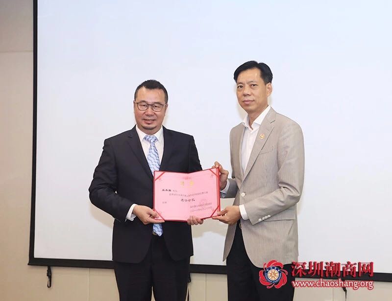 赵财强会长(左)代表深圳潮人海外经济促进会聘请黄育宏驻会会长(右)担任该会第六届名誉会长