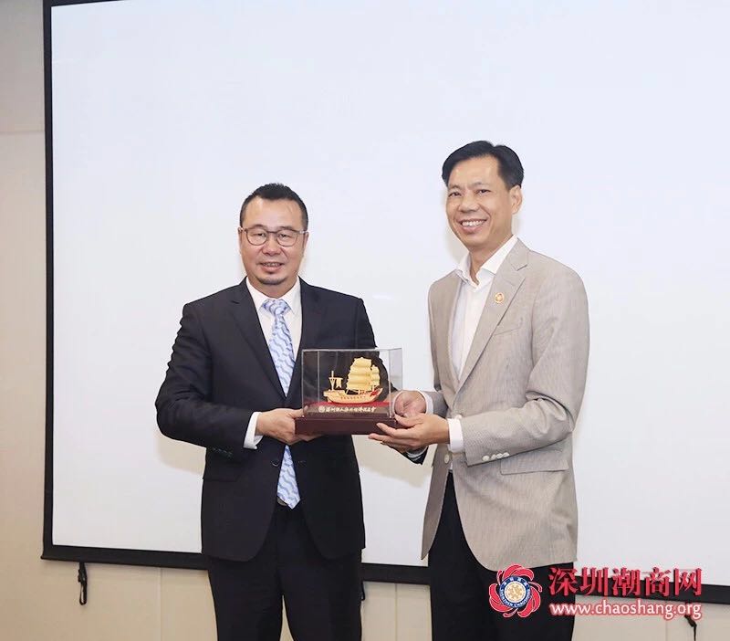吴木棠会长(右)代表商会向深圳潮人海外经济促进会赠送纪念品