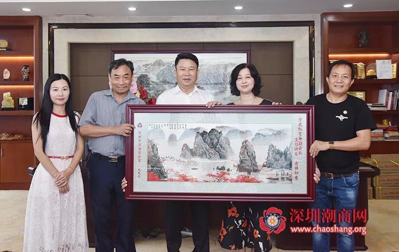 黄梓琪秘书长(左二)代表商会向方武权常务副会长(中)送上一幅潮绣珍品作为生日贺礼