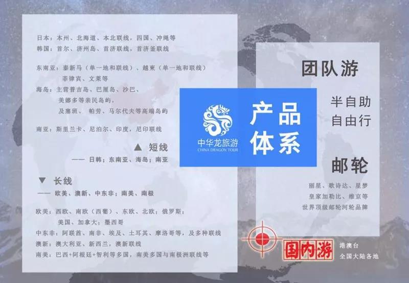 深圳中华龙旅游集团有限公司主要提供旅游打包产品、旅行自助单品和套餐,以及包团定制活动的解决方案及目的地服务。目前产品线路基本覆盖七大洲各主流目的地,包括但不限于日韩、东南亚、欧美、澳新、中东非、南亚、拉美和南极等。涵盖团队游、半自助、自由行全类别。