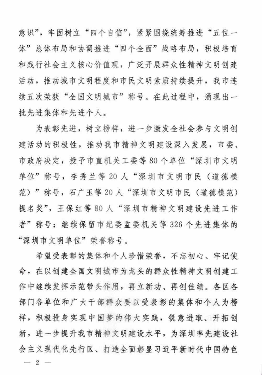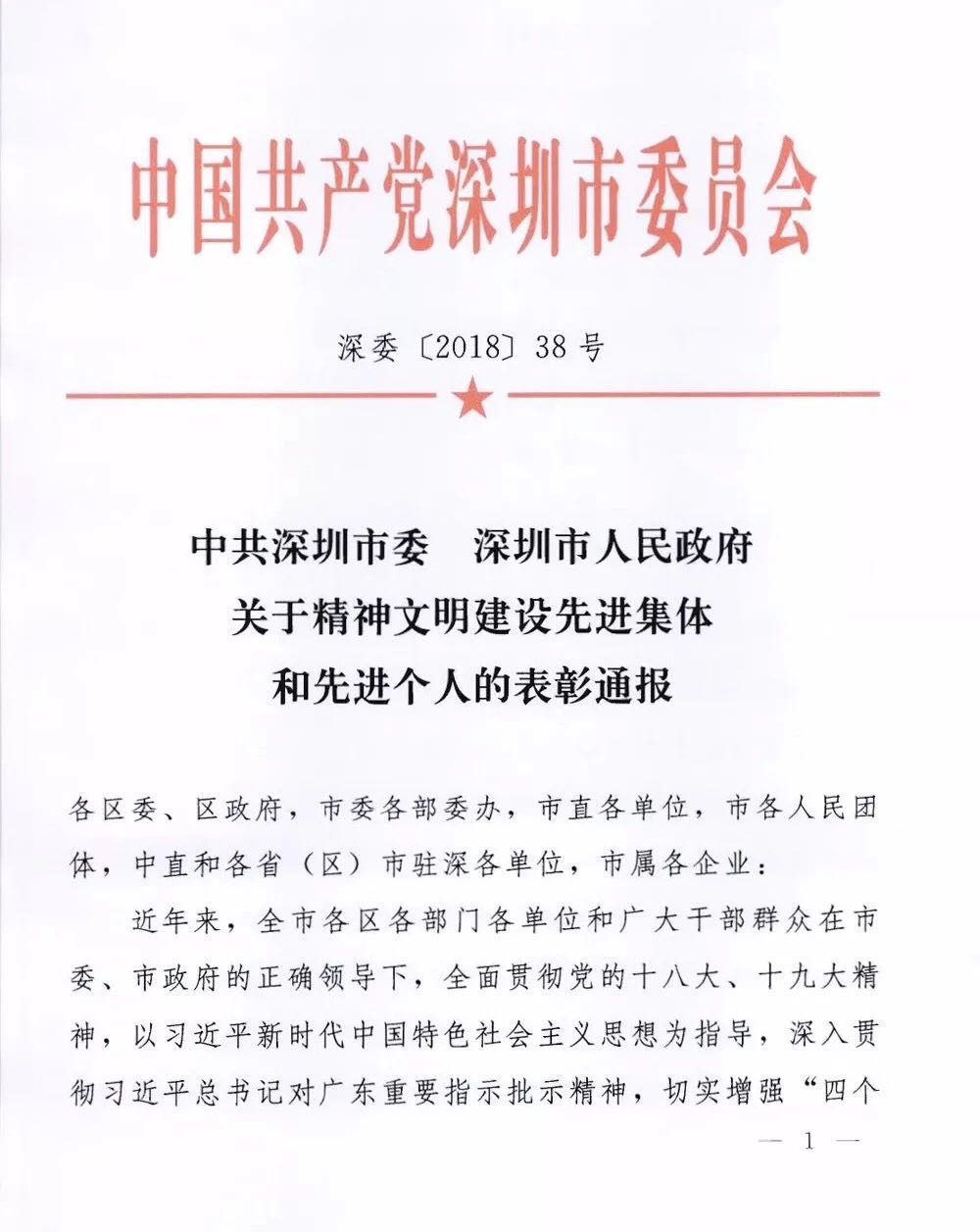 近日,中共深圳市委、深圳市人民政府印发《关于精神文明建设先进集体和先进个人的表彰通报》,下载安装 荣获“深圳市文明单位”称号。