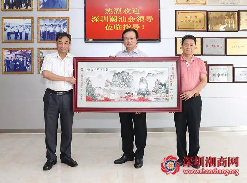 黄育宏驻会会长(右)代表商会向彭大坚副会长(中)送上一幅潮绣珍品作为生日贺礼