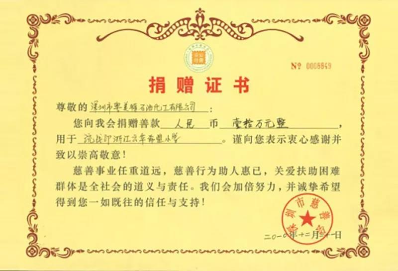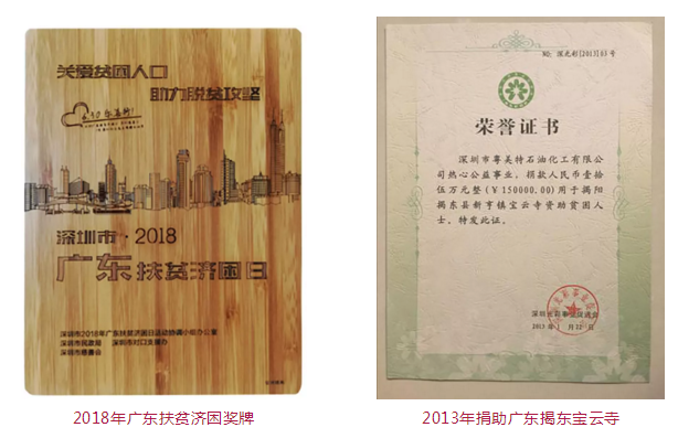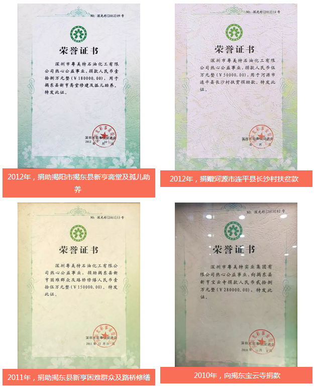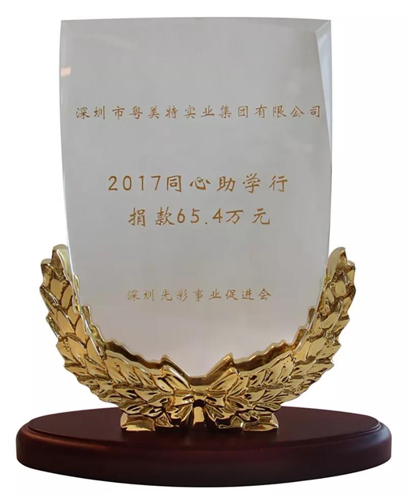 2016年,粤美特集团以 1842.5 万元的慈善捐赠金额荣获“深圳慈善捐赠企业榜第 10 名”,荣膺“鹏城慈善捐赠企业金奖”;2017 年,又以2280.04万元的慈善捐赠金额荣获“深圳慈善捐赠企业榜第六名”。