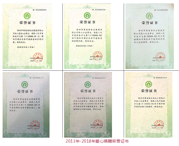 2018年,在深圳市文明委主办的“2018感动深圳——第十五届深圳关爱行动表彰晚会”上,粤美特实业集团有限公司被授予“十佳爱心企业”荣誉称号。