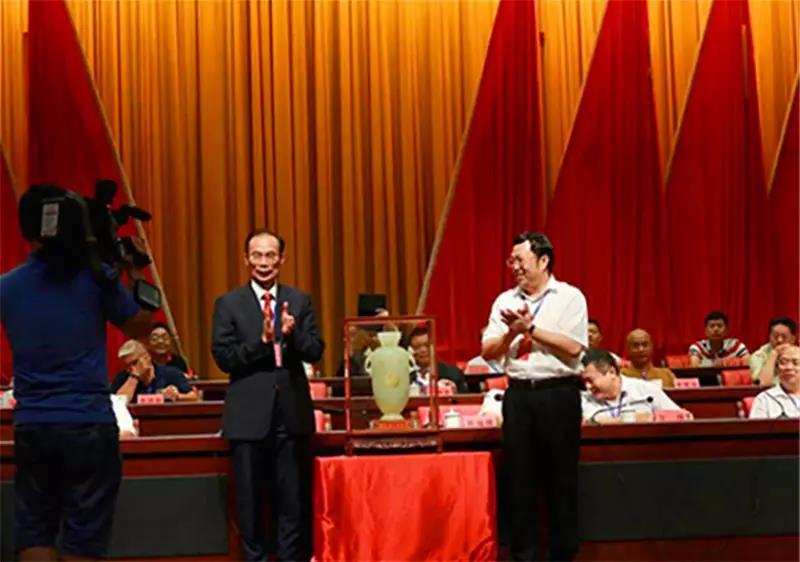 2018年,在“同心助学行”、“先心救助公益行”授牌仪式上,市委常委、统战部长林洁为许锦光董事长授牌