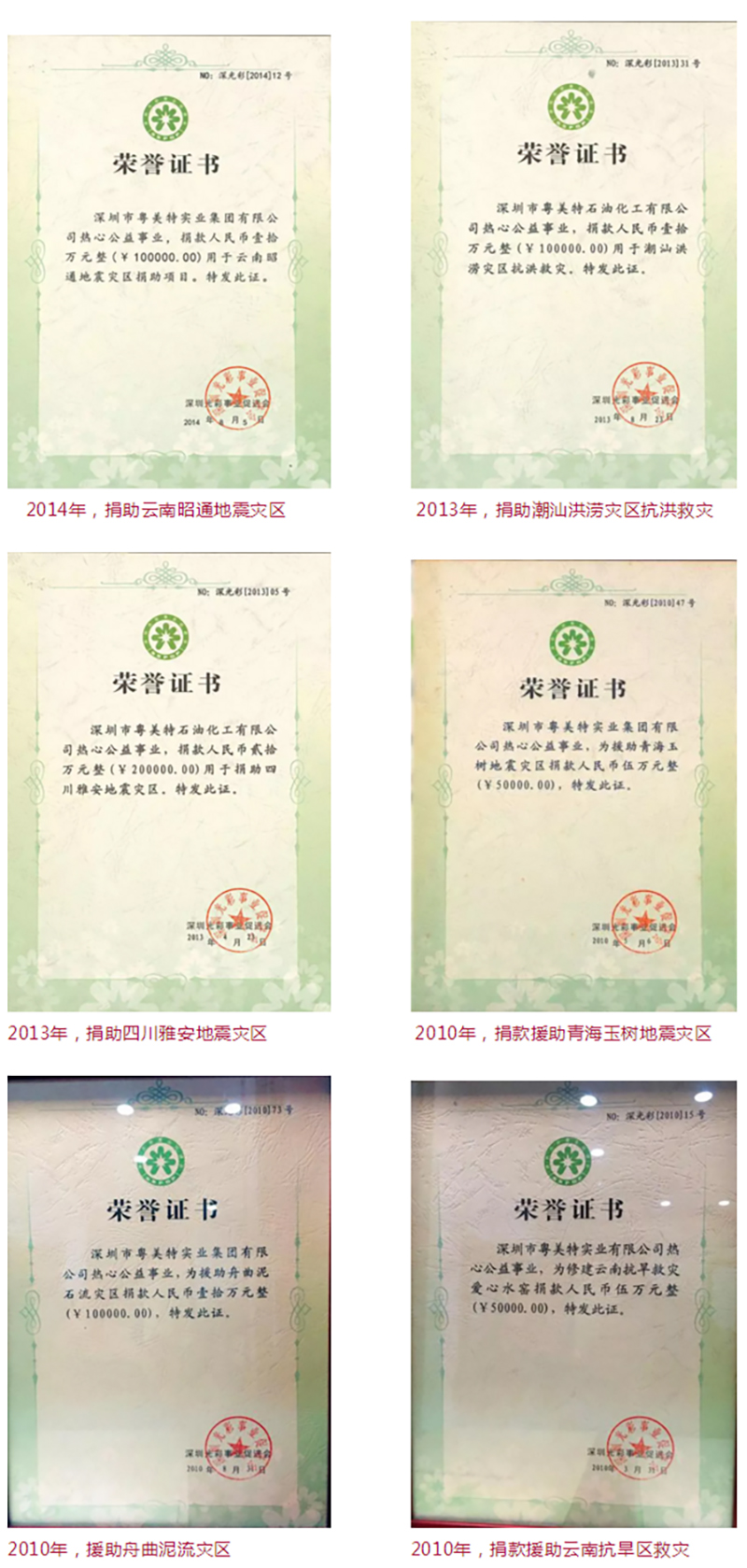 多年来,粤美特集团积极援助了四川地震灾区、青海玉树地震灾区、四川雅安地震灾区、西南旱灾区、甘肃舟曲泥石流灾区、广东潮汕洪涝灾区等,彰显了强烈的社会责任感和博爱无私的情怀。
