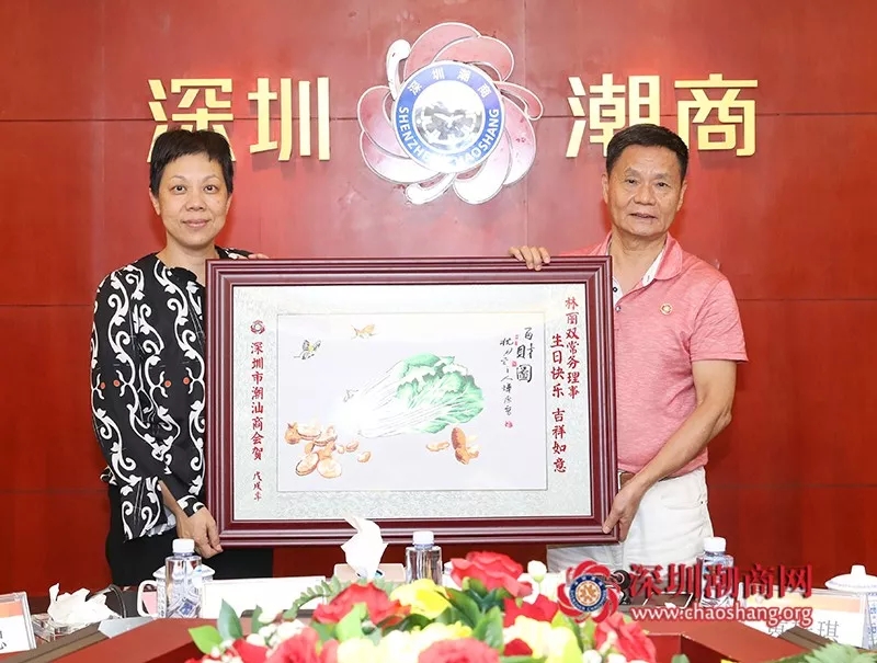 黄育宏驻会会长(右)代表商会为常务理事林丽双(左)送上一幅潮绣珍品作为生日贺礼