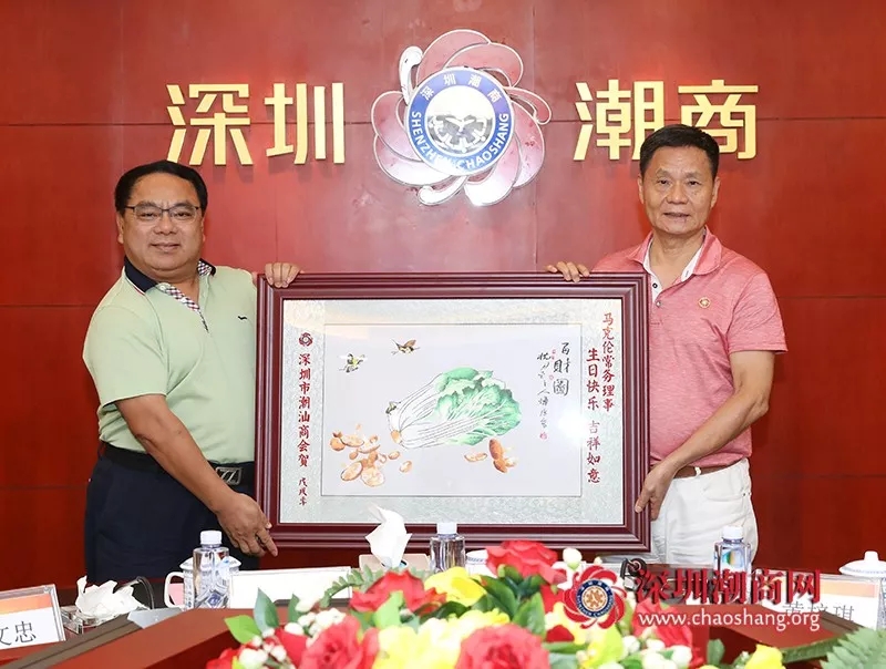 黄育宏驻会会长(右)代表商会为常务理事周汉鹏(左)送上一幅潮绣珍品作为生日贺礼