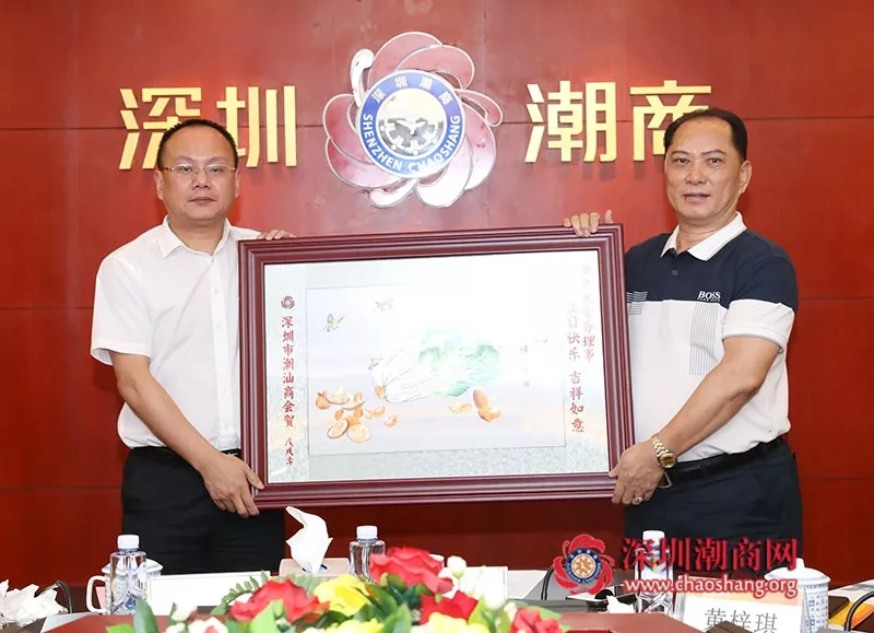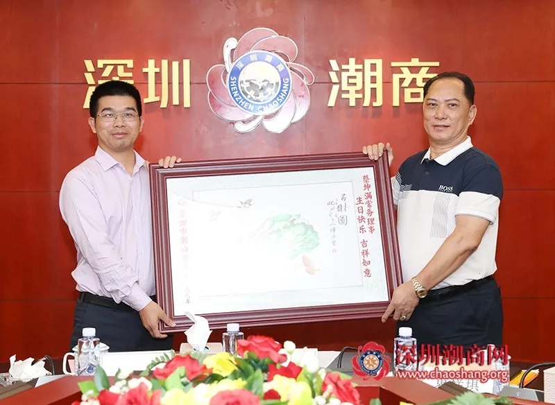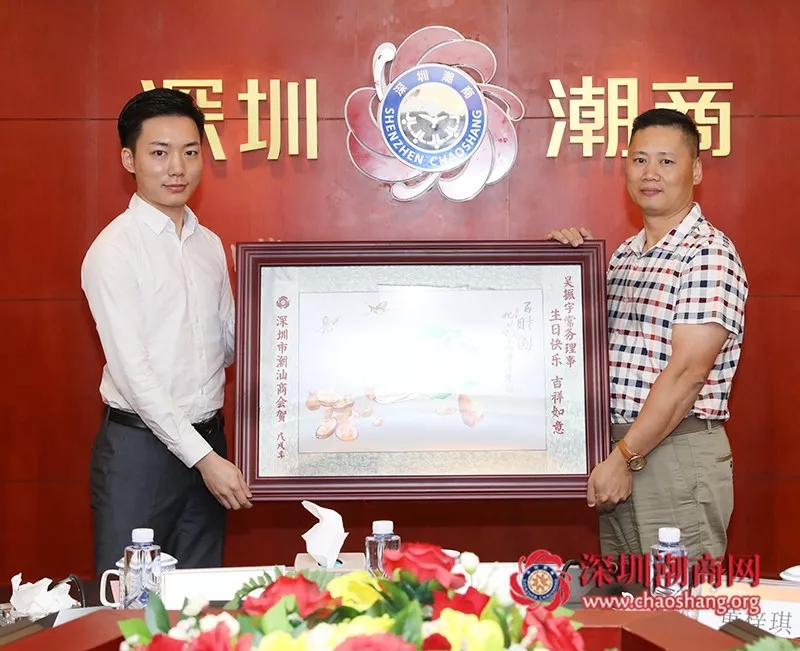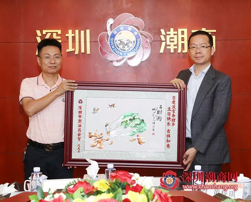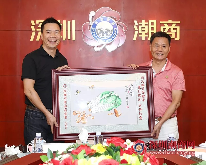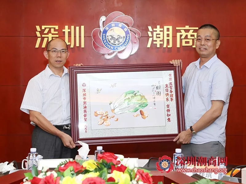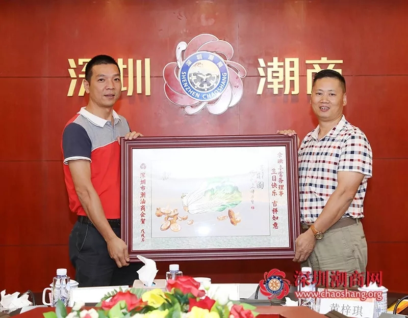 倪潮锋轮值副会长(右)代表商会为常务理事黄奕波(左)送上一幅潮绣珍品作为生日贺礼