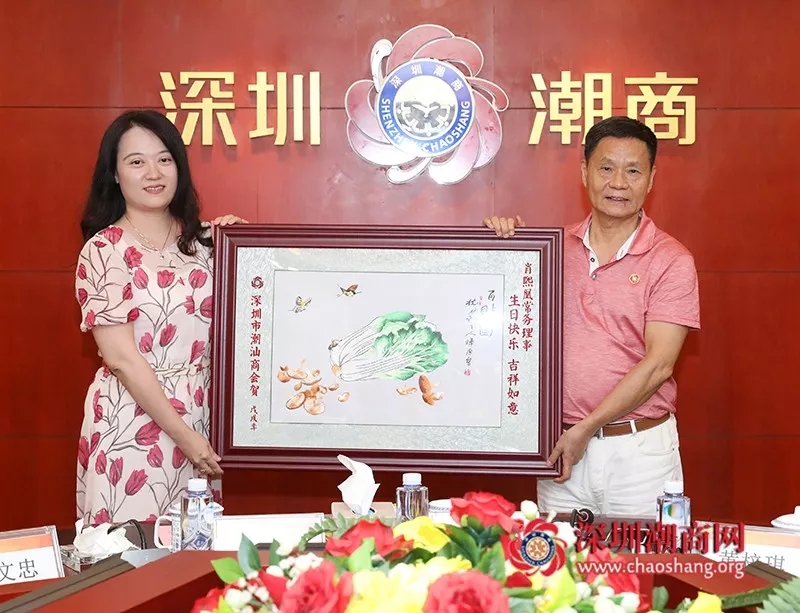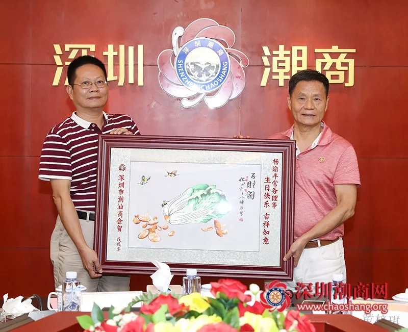 黄育宏驻会会长(右)代表商会为常务理事杨瑜平(左)送上一幅潮绣珍品作为生日贺礼