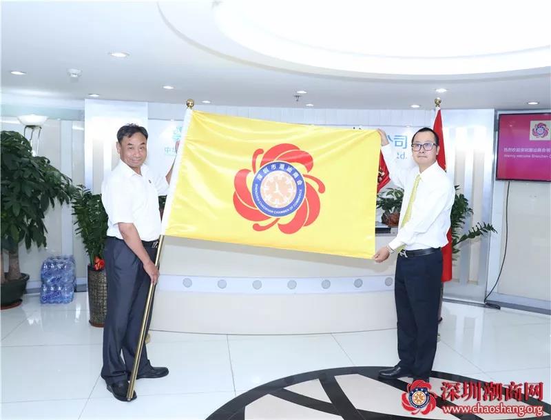 黄梓琪秘书长(左)代表商会向黄秋鹏副会长(右)送上会旗