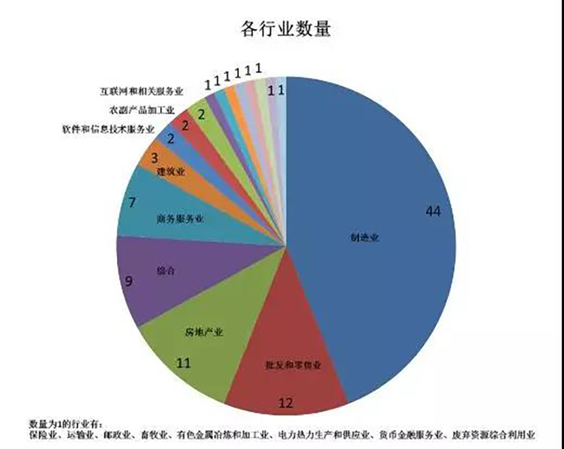 按行业分布,制造、批发零售和房地产业占比较大。其中制造业44家,较去年减少7家;批发和零售业12家,较去年减少1家,房地产业11家,较去年增加2家;综合9家,商务服务业7家,建筑业3家,软件和信息技术服务业、农副食品加工业、互联网和相关服务业各2家,保险业、运输业、邮政业、畜牧业、有色金属冶炼和加工业、电力热力生产和供应业、货币金融服务业、废弃资源综合利用业各1家。