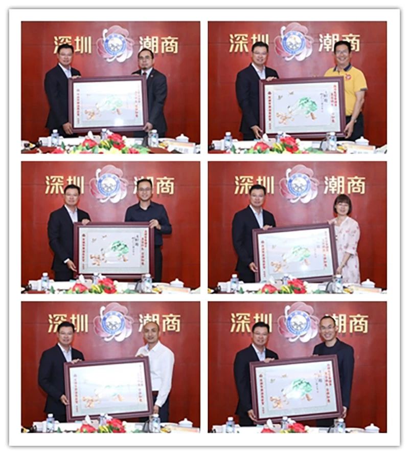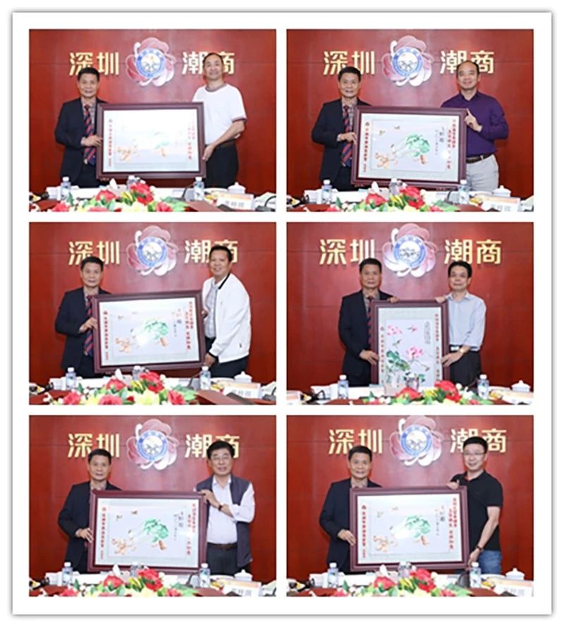 林强有轮值会长(左)代表商会为常务理事吴伟杰、魏伟光、庄研、肖巧璇、黄少军、陈坤忠送上一幅潮绣珍品作为生日贺礼