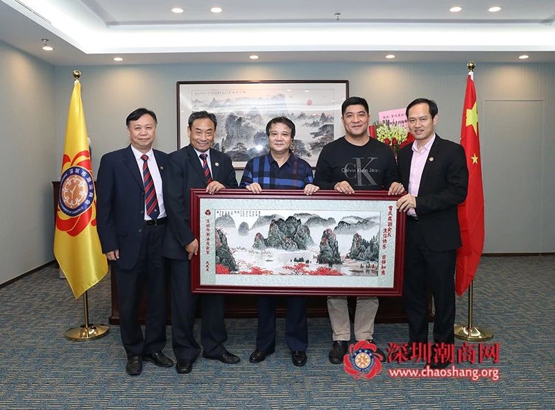 黄梓琪秘书长(左二)代表商会向曾庆霖副会长(中)送上一幅潮绣珍品作为生日贺礼
