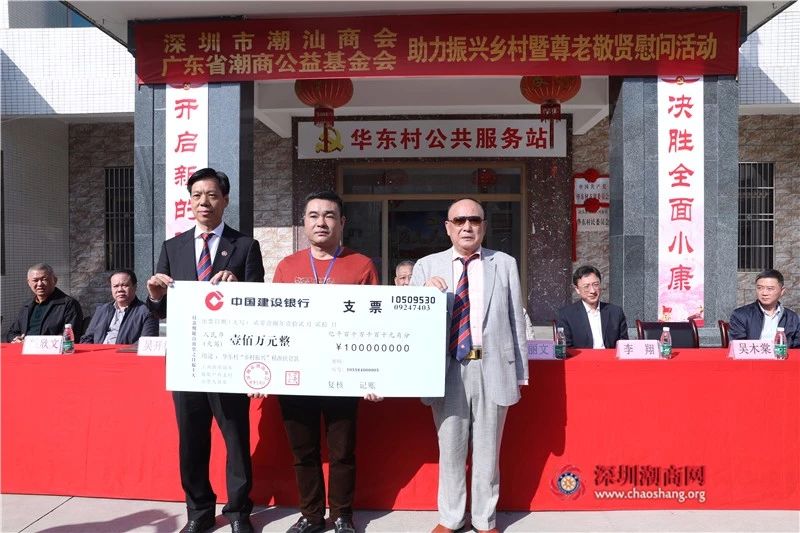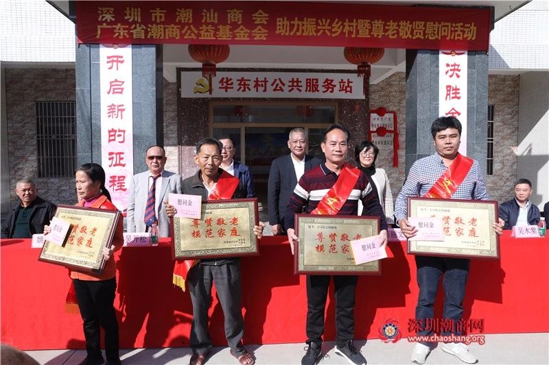 活动上,吴开松创会会长、吴木棠会长代表商会向华东村委捐赠50万元,华东村吴茂才书记接受捐赠资金。汕头市委副书记钟挥锷,汕头市委常委、统战部部长陈丽文,潮阳区委书记蔡永明和我会创会会长吴开松向尊老敬贤模范家庭颁发牌匾及慰问金。