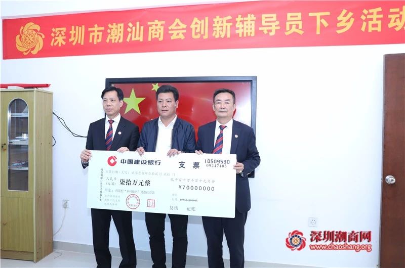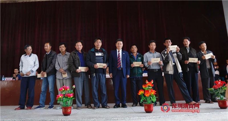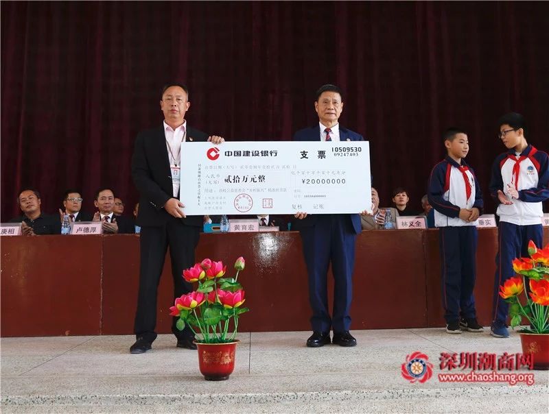 黄育宏驻会会长(右)代表商会向潮南区西岐学校捐赠“乡村振兴”精准扶贫款30万