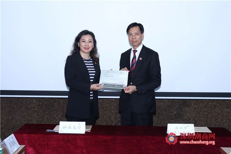 座谈会上,在大家的共同见证下,吴木棠会长与姜虹书记签署就业合作框架协议,开启双方合作交流新篇。同时,吴木棠会长代表商会向汕头大学捐赠50万元,用于学校教育教学工作的开展,姜虹书记接受捐赠资金,同时向吴木棠会长颁发证书。