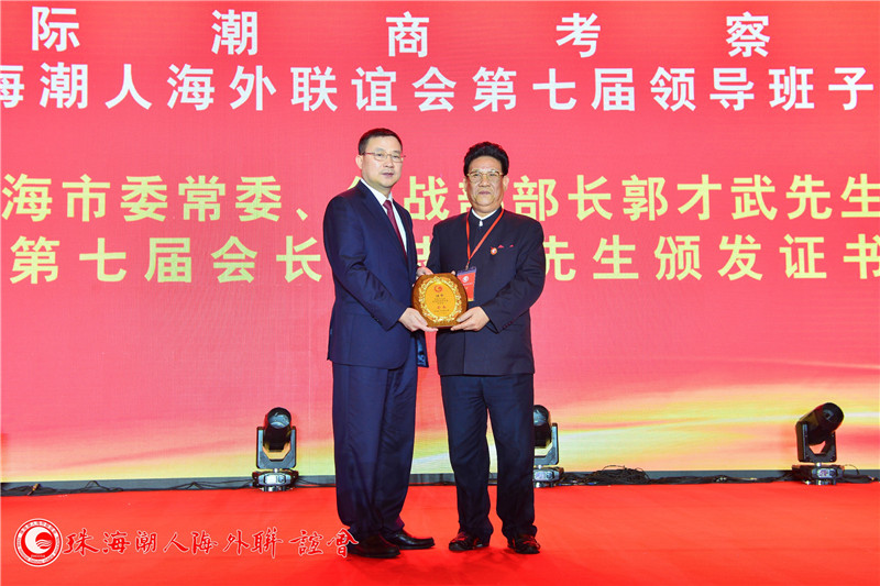 珠海市委常委、统战部部长郭才武向珠海潮联会第七届会长郑志才颁发证书