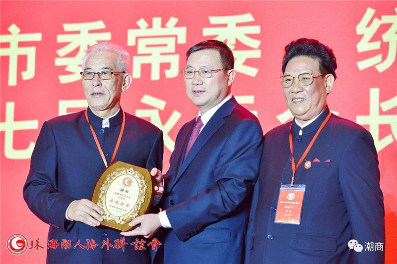 珠海市委常委、统战部部长郭才武向珠海潮联会第七届永远会长郑通亮颁发证书