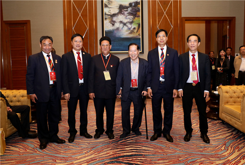 澳洲潮州同乡会董事局主席周光明(中),珠海潮联会会长郑志才(左三),我会会长吴木棠(右二),广西潮人会、潮商会会长许朱鸿(右一),第九届潮商大会主席郑楚成(左二),我会常务副会长兼秘书长黄梓琪(左一)等合影