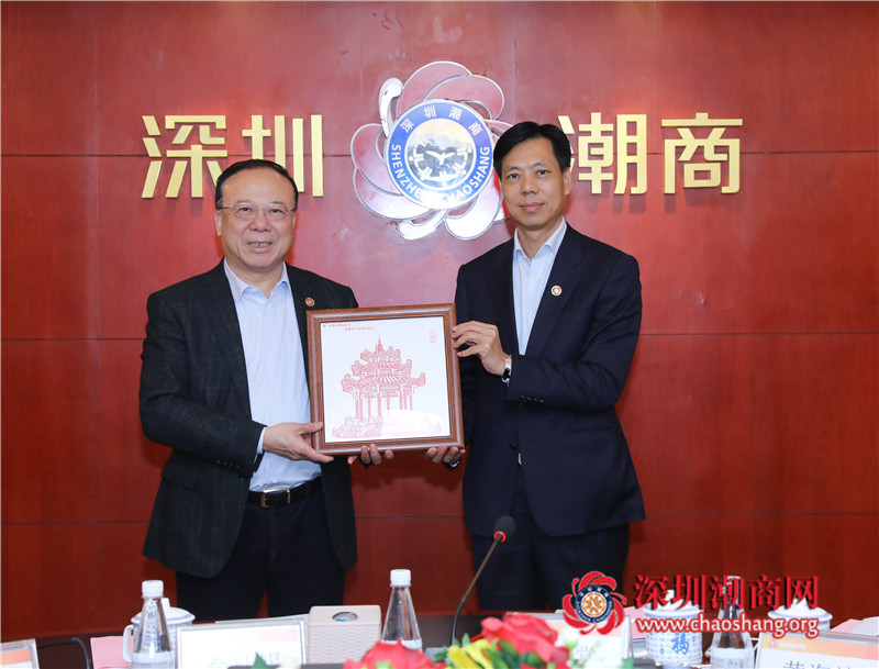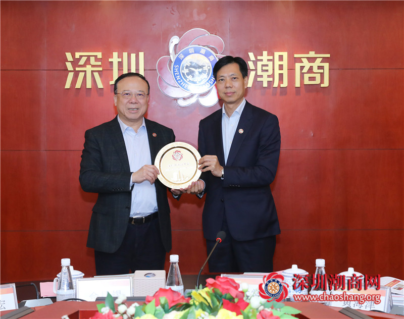 吴木棠会长(右)代表商会向深圳市产业园区商会赠送纪念品
