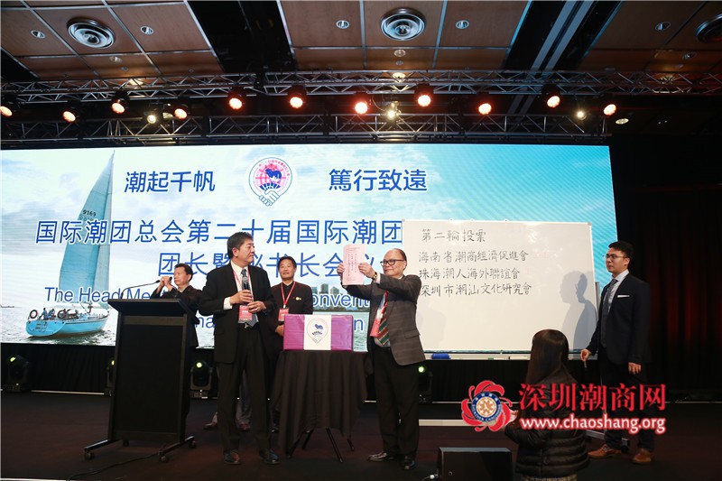 经过第二轮投票,海南省潮商经济促进会角逐取胜,国际潮团总会主席张乙坤郑重宣布:海南省潮商经济促进会获得2021年第二十一届国际潮团联谊年会举办权。