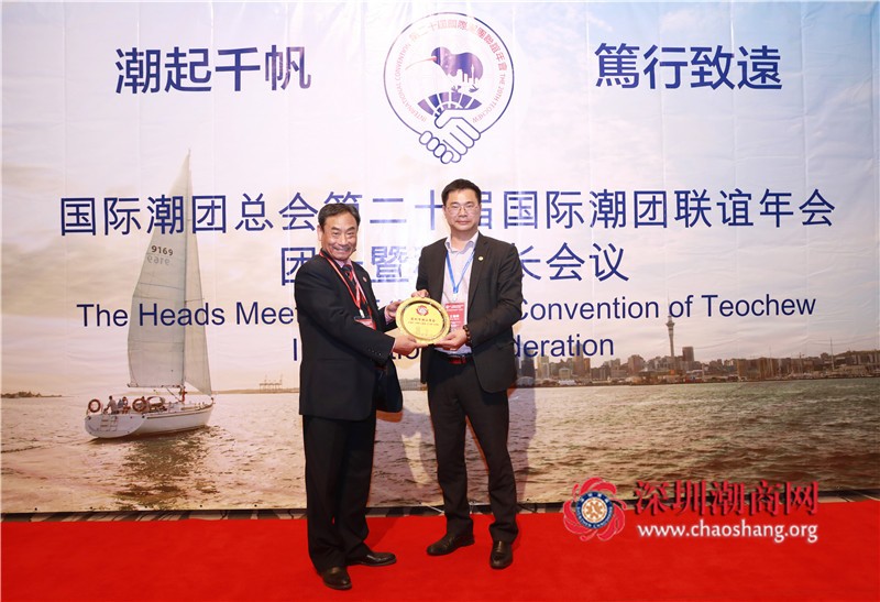 国际潮团总会主席、新西兰潮属总会主席张乙坤(中)向我会赠送纪念品