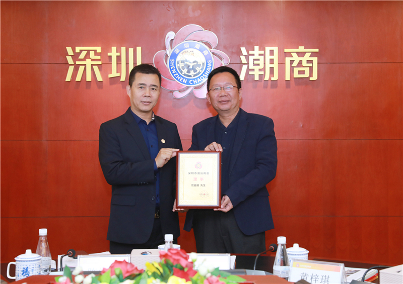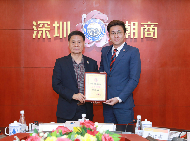 陈镇文轮值会长(左)为理事詹益播(右)颁发牌匾