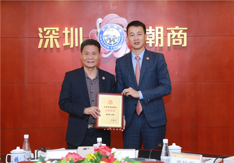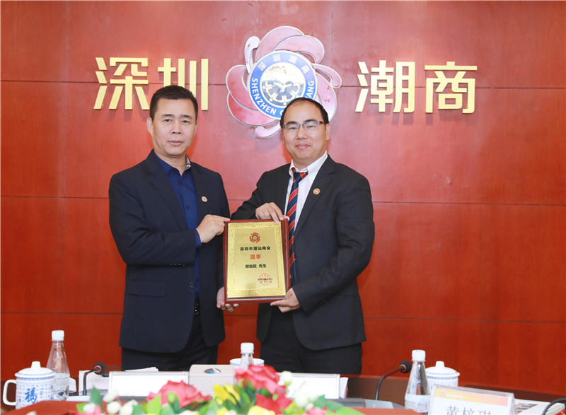 陈镇文轮值会长(左)为理事郑如旺(右)颁发牌匾