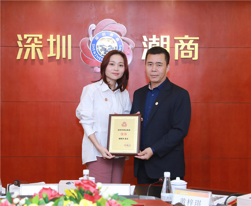 陈镇文轮值会长(右)为理事侯枋汐(左)颁发牌匾
