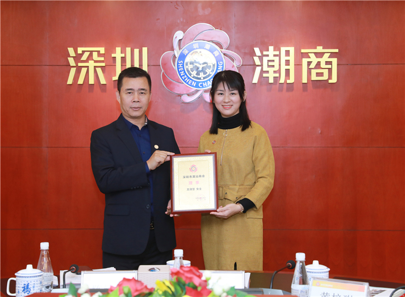 陈镇文轮值会长(左)为理事方泽慧(右)颁发牌匾