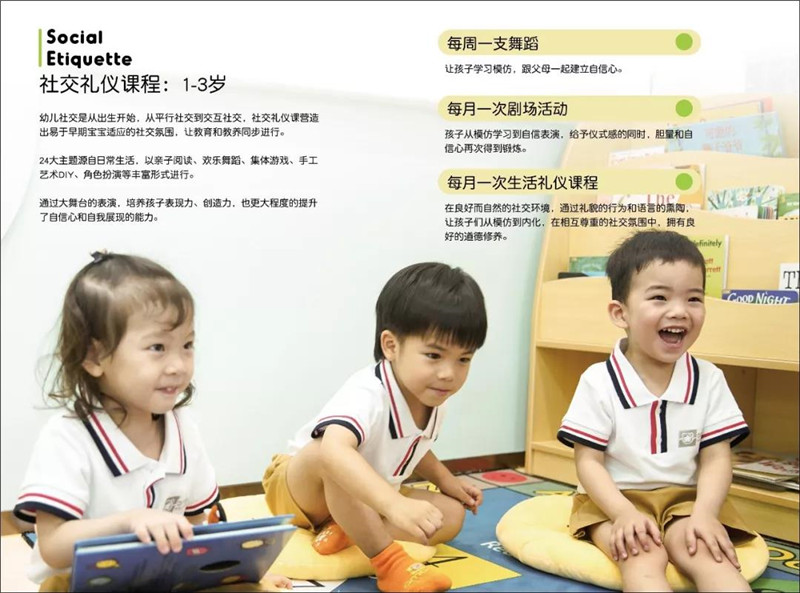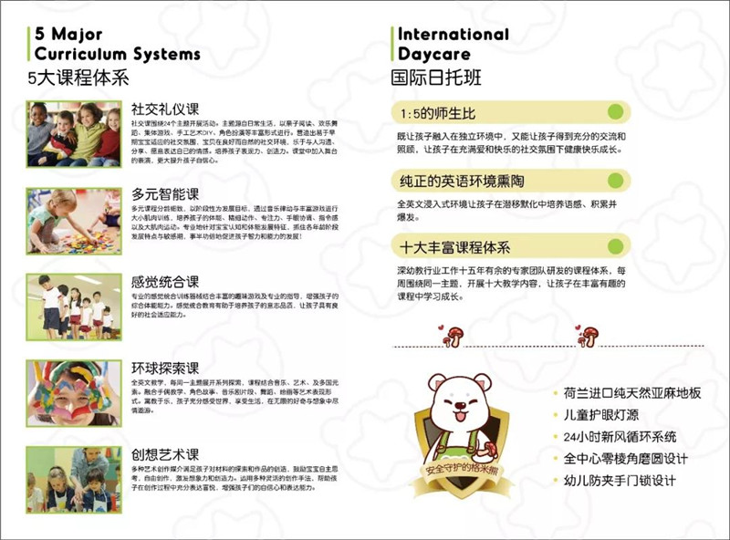 格米熊根据英国国际早期教育体系EYFS教育理念,秉承3大方向(认知、个人、人际),6大核心(道德与责任、自觉与自信、沟通与协作、开放与尊重、语言、世界文化与全球议题)为教育理念,开设了5+1的课程体系。