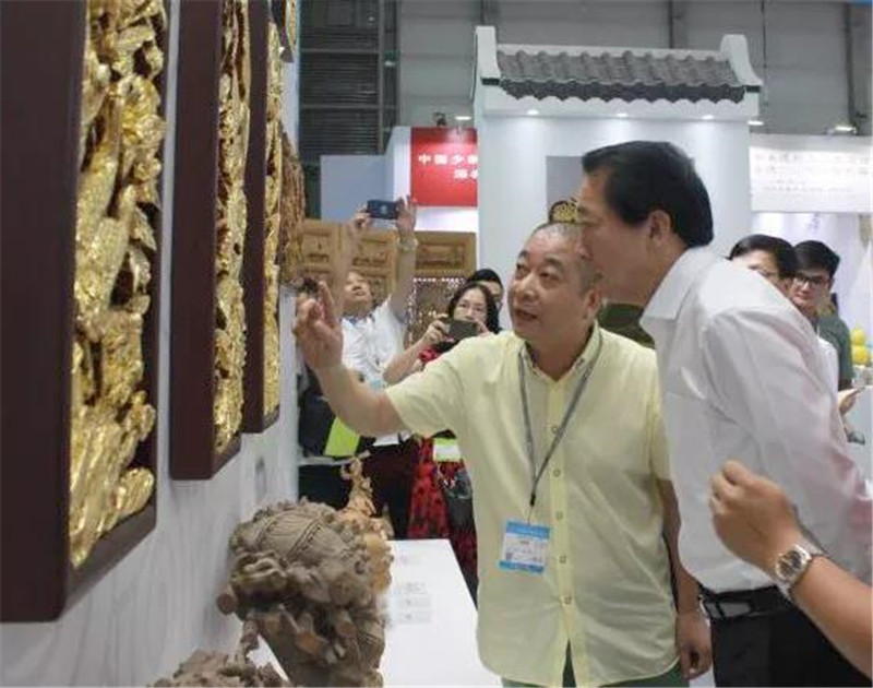 我会常务理事丁全单位来成号古建筑公司作为此次文博会汕尾馆的重要参展单位之一,来成号古建筑公司的众多古木雕、金漆木雕、屏风挂幅产品得到了杨市长的肯定,特别对精致的“甲子金漆木雕”给予高度赞赏,并详问制作流程和推广工作、文创思路等。