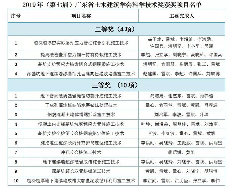 2019年6月10日,第七届广东省土木建筑学会科学技术奖获奖项目结果出炉,我会常务副会长林强有单位深圳工勘岩土集团主持研发的14项施工技术榜上有名,其中4项荣获二等奖、10项荣获三等奖,刷新了公司年度科研创新成果荣获省级科技奖的最高记录!