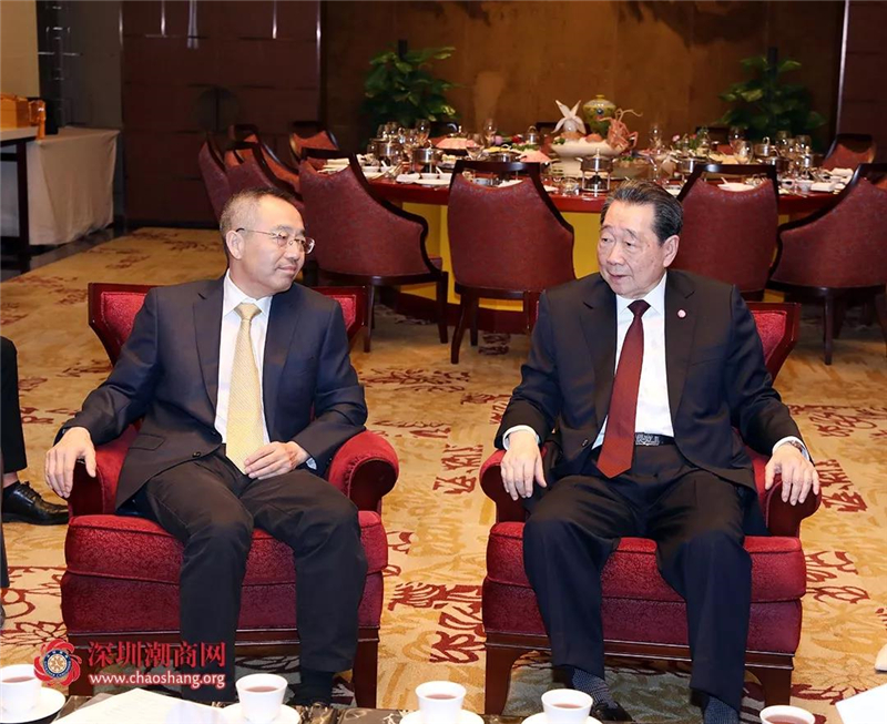 正大集团资深董事长谢国民(右)与全国工商联原党组副书记、原专职副主席、潮商东盟投资基金筹备组组长黄小祥(左)交流
