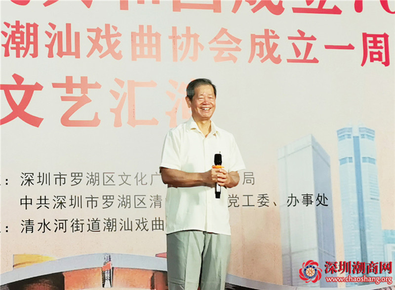 深圳市委宣传部原副部长、深圳特区报社长、我会名誉会长吴松营发表致辞,他表示,清水河潮汕戏曲协会举办文艺汇演,献礼新中国成立70周年,以此活跃节日氛围,增强社区凝聚力,进一步弘扬潮汕文化,这是潮汕艺术界、戏曲界的一件喜事。清水河潮汕戏曲协会成立一年多来,开展了许多有声有色的文化活动,相信在区政府、街道办的大力支持下,在潮汕戏曲爱好者的共同努力下,协会将继承和发扬潮汕优秀文化传统,为潮汕戏曲事业的未来发展开拓新天地,谱写新篇章。